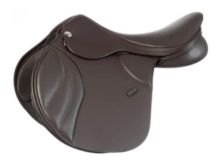 The saddle features broad, wool flocked panels and girthing options to maximize contact and saddle stability, while the quality leather seat and knee pads give the feel of riding on an all leather saddle.